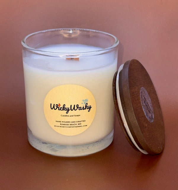 Experience a fireside glow with our 10 ounce crackling wood-wick candle in an elegant 12 ounce clear glass reusable jar. Hand-poured with our luxuriously creamy coconut-soy blend wax and topped with a richly finished walnut lid. Available in your choice from our selection of curated fragrances available for this container.